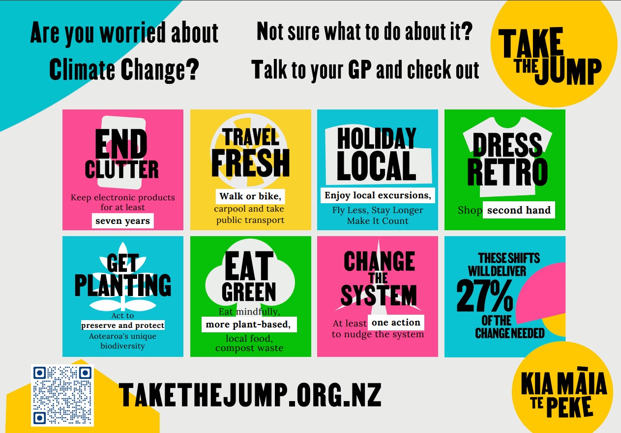 Our friends from Take the Jump have created posters for GPs and other health professionals to hang up in their waiting rooms. These posters highlight seven shifts to support wellbeing, live with joy, and protect nature.