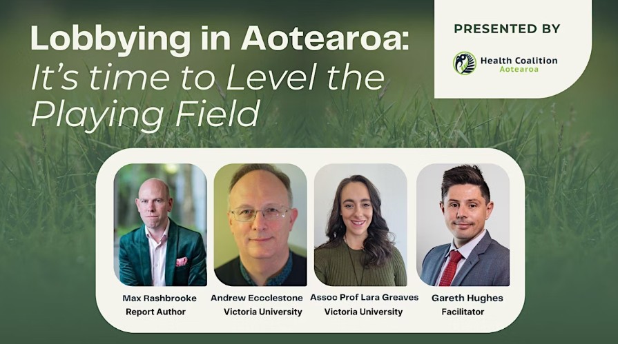 Health Coalition Aotearoa is hosting a webinar about their campaign, Level the Lobbying Playing Field. Register here.
